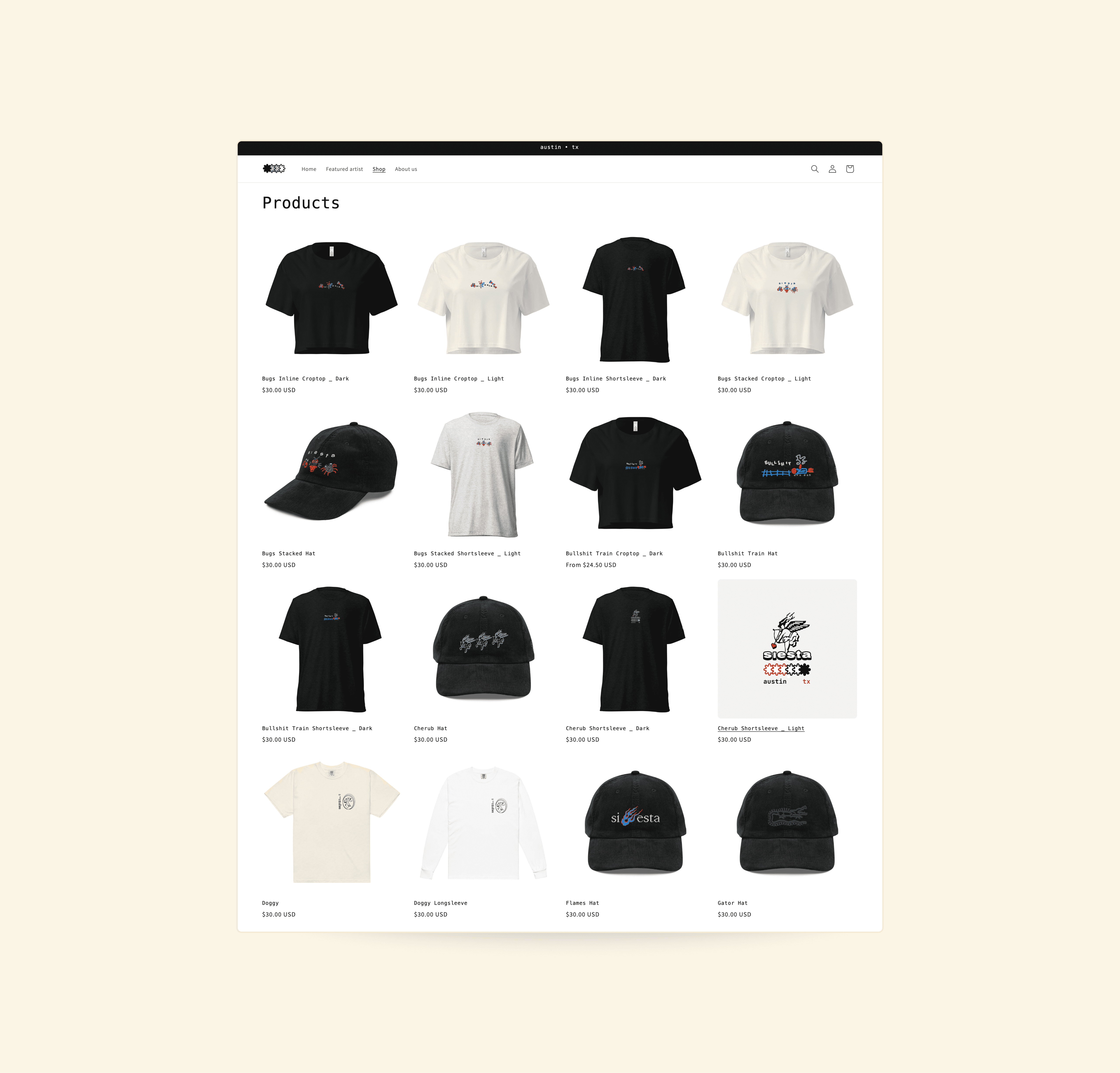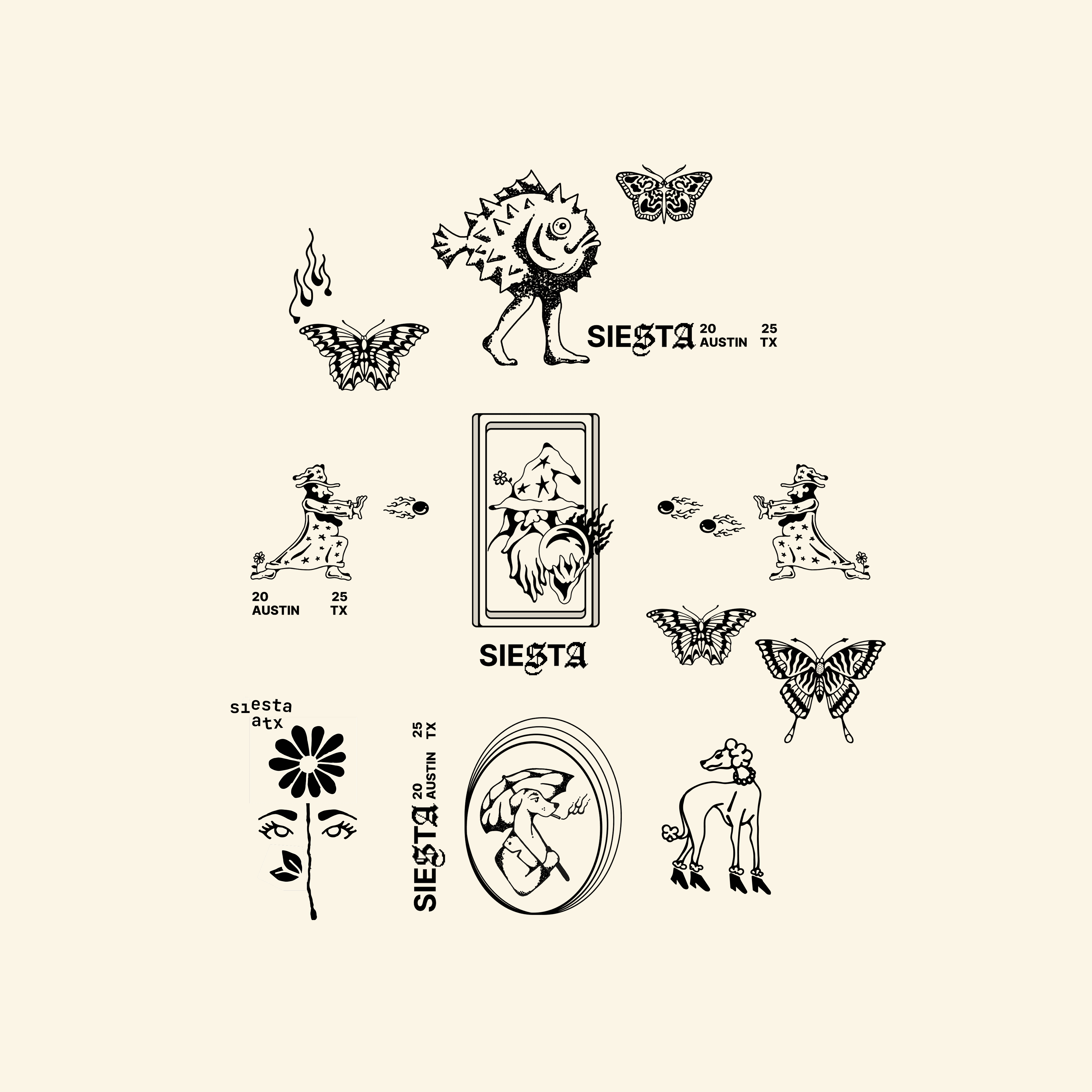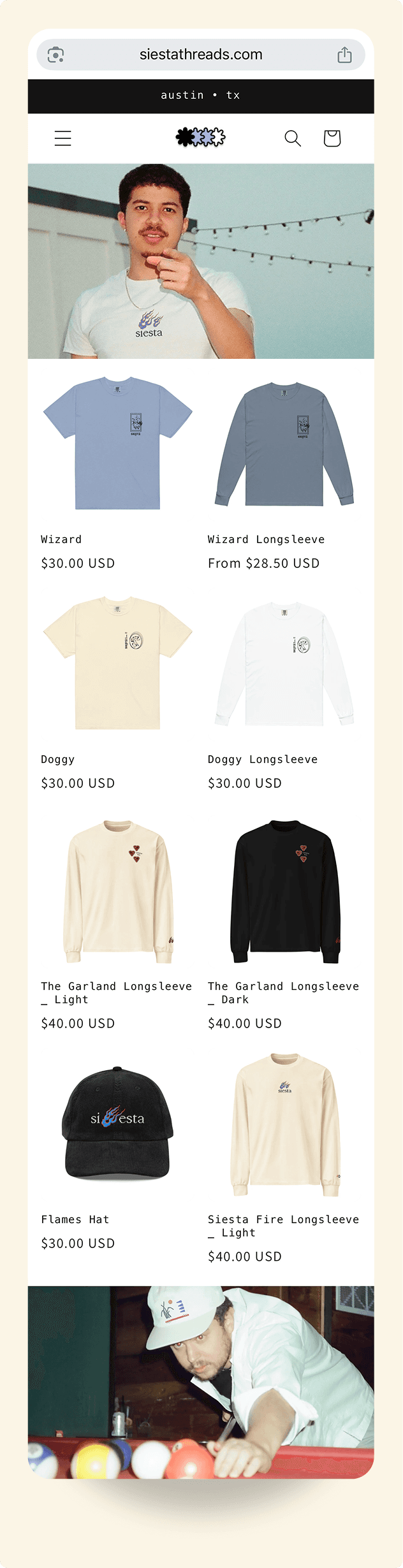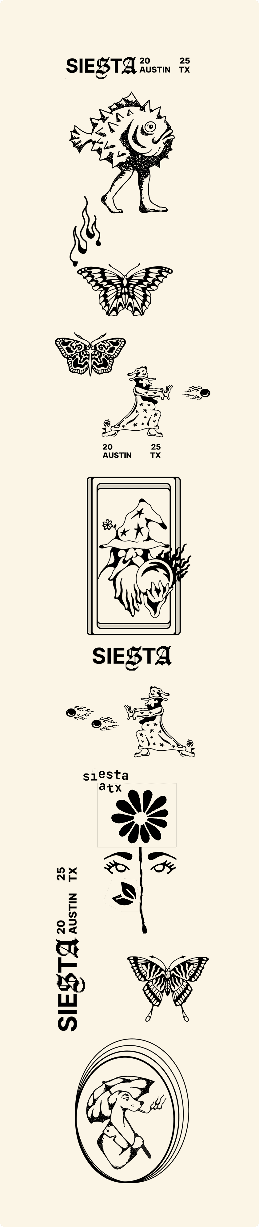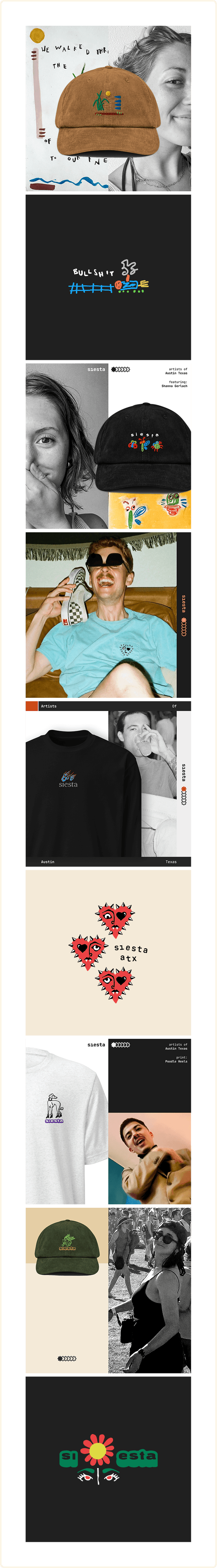 About a year ago I began my apparel brand Siesta. It was a way to apply my doodles to wearables and get my friends involved. High quality materials with stitched-in details. Take these, put em on my buddies, and play around with film photos and some graphic design. There's nothing better.