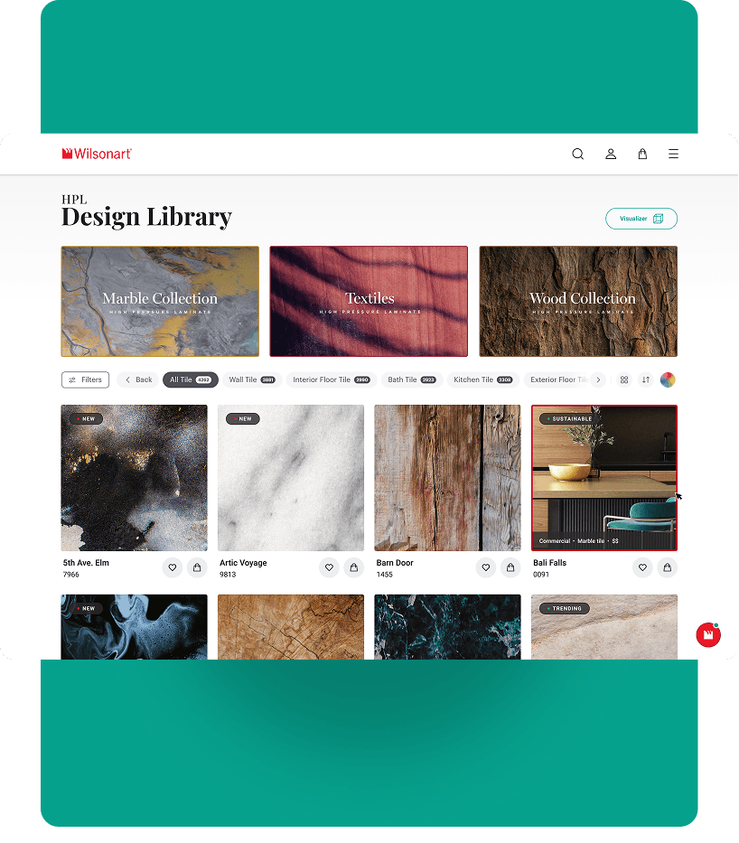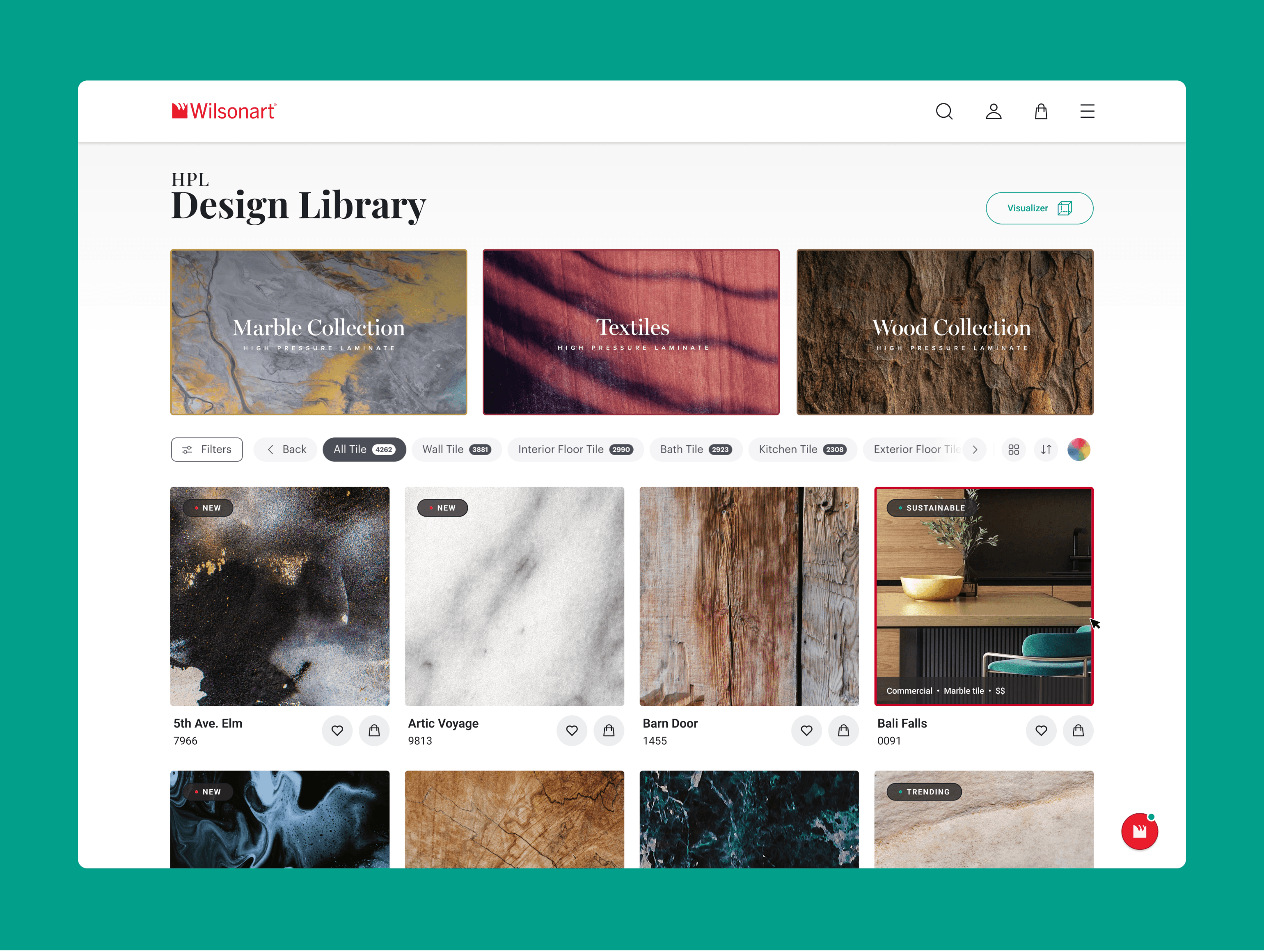 Another quick conceptual sprint challenged me to accentuate the beauty and detail engrained in every HPL (high pressure laminate) surface sold by Wilsonart. The original website had a library of tiles, but they were not well organized and did not demonstrate a strong visual preview of the product consumers were shopping for online.