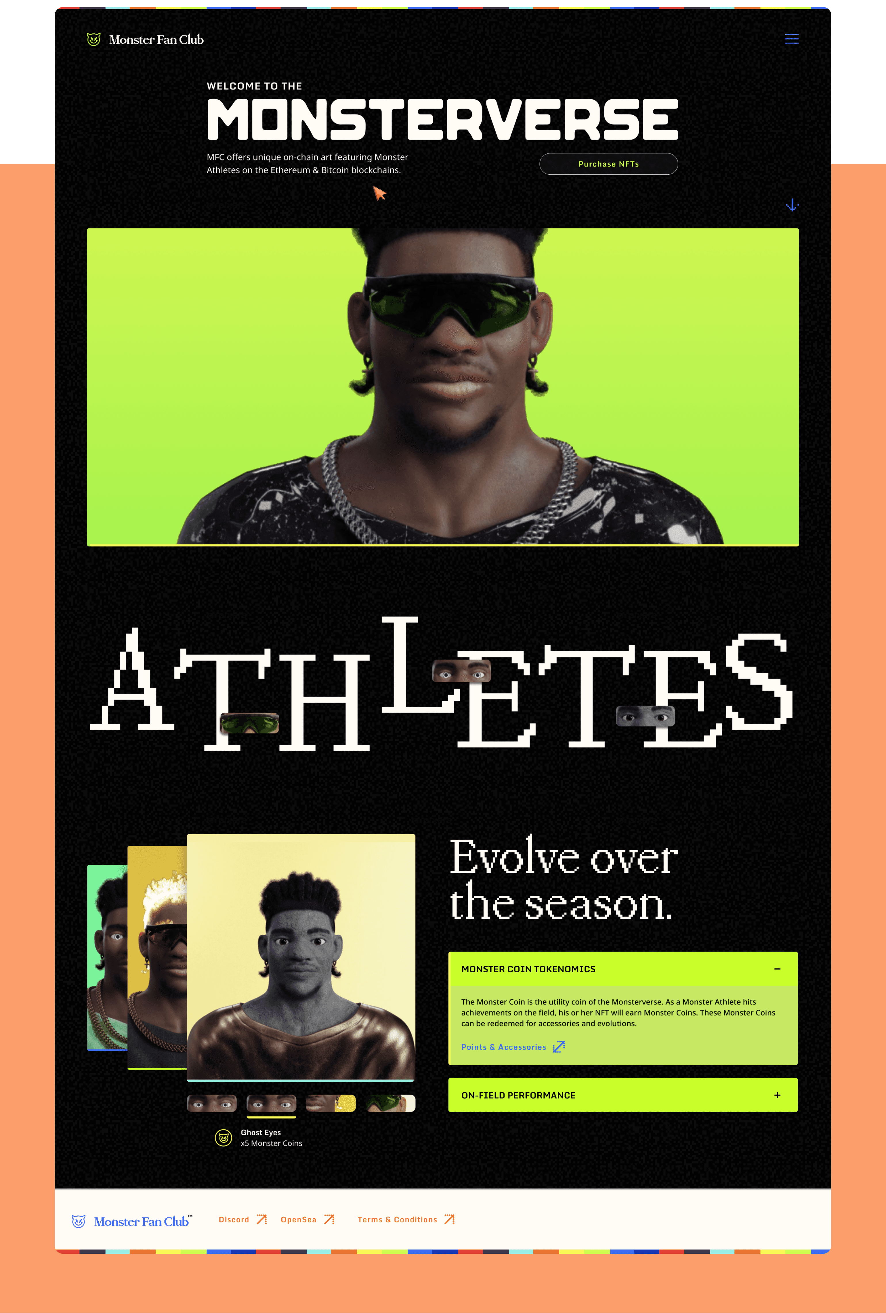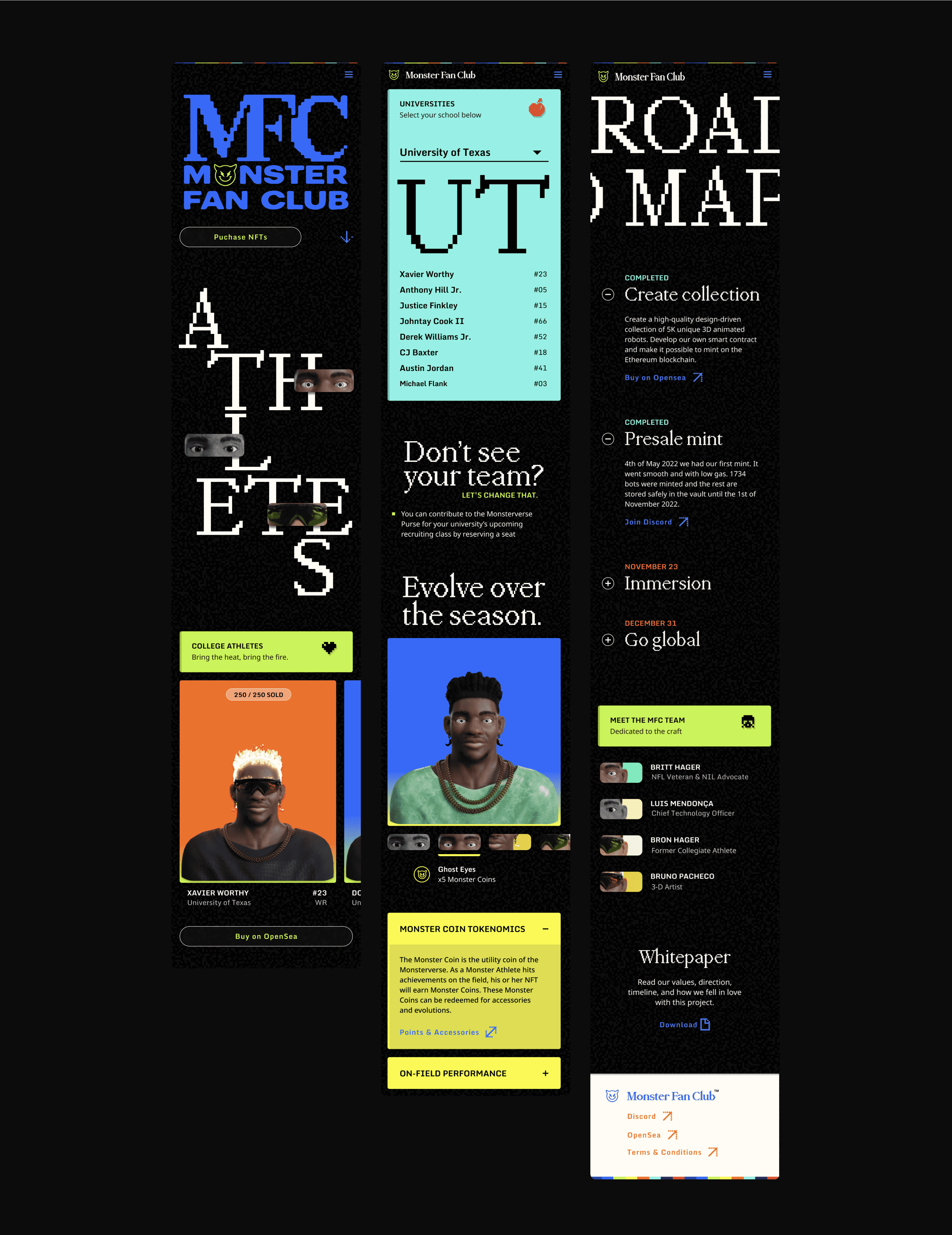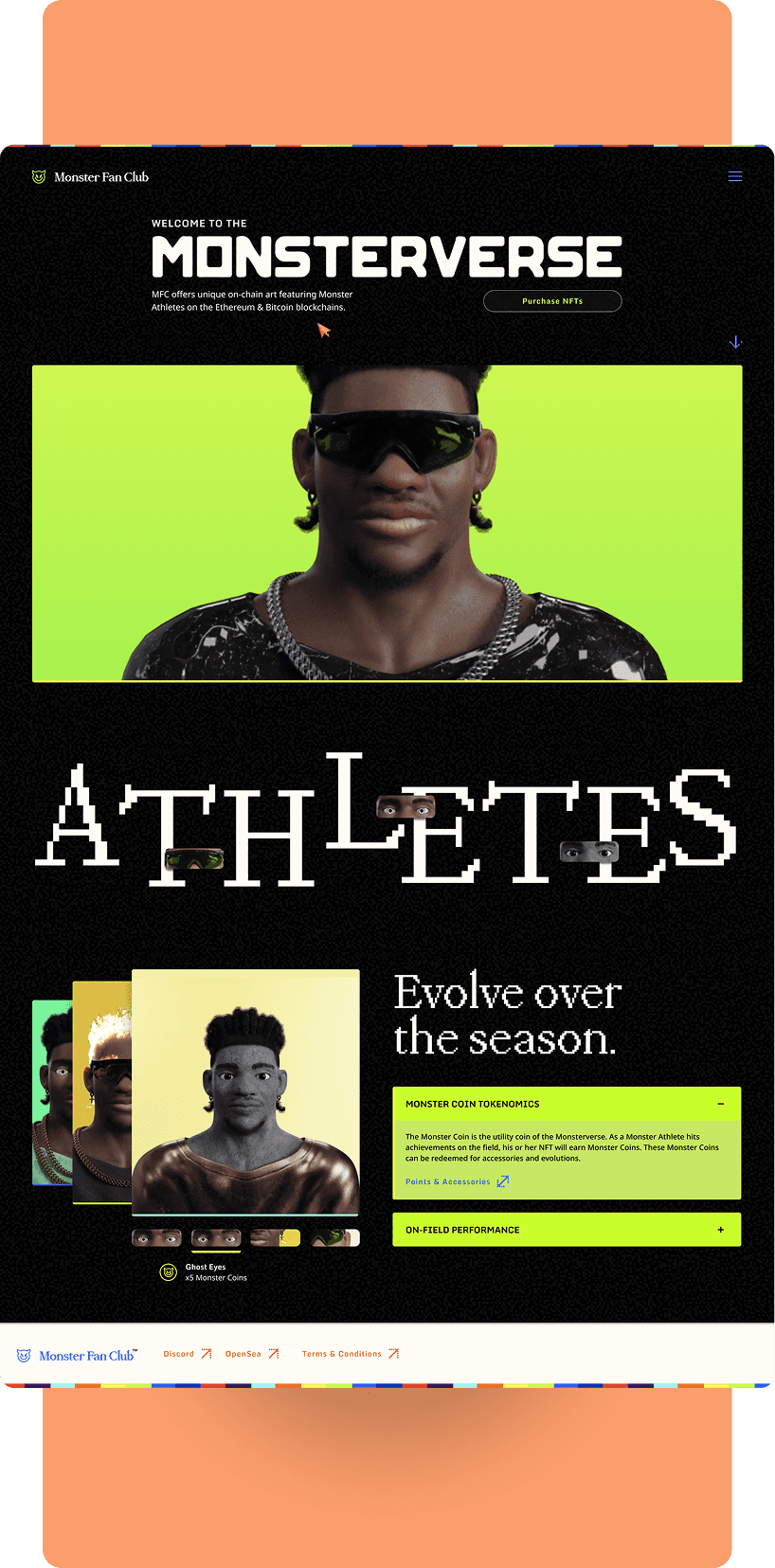 NIL deals in the NCAA combined with NFTs. Lots of acronyms. Monster Fan Club needed a website that exemplified how consumers could collect digital trading cards (NFTs) that directly connected to their favorite athletes. With the new NIL negotiations in college football, team members could cash in by participating in the club.