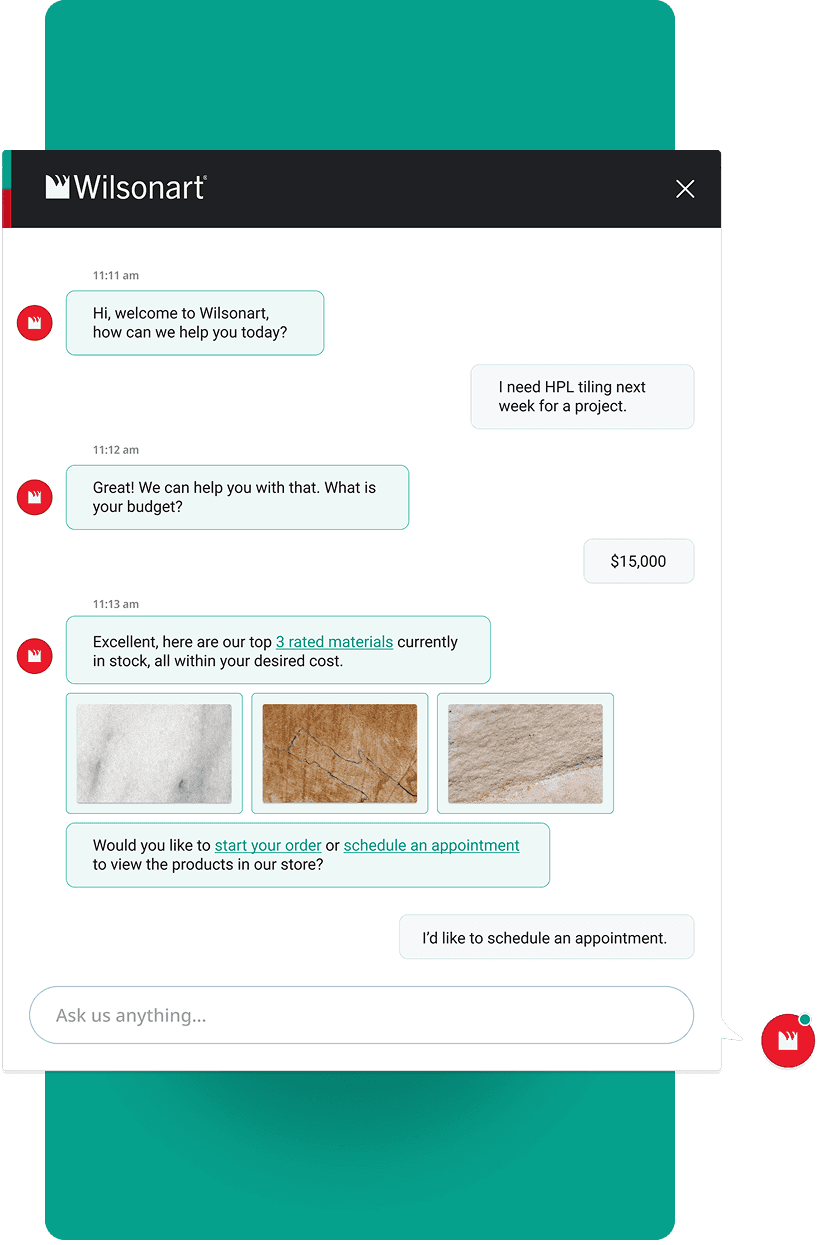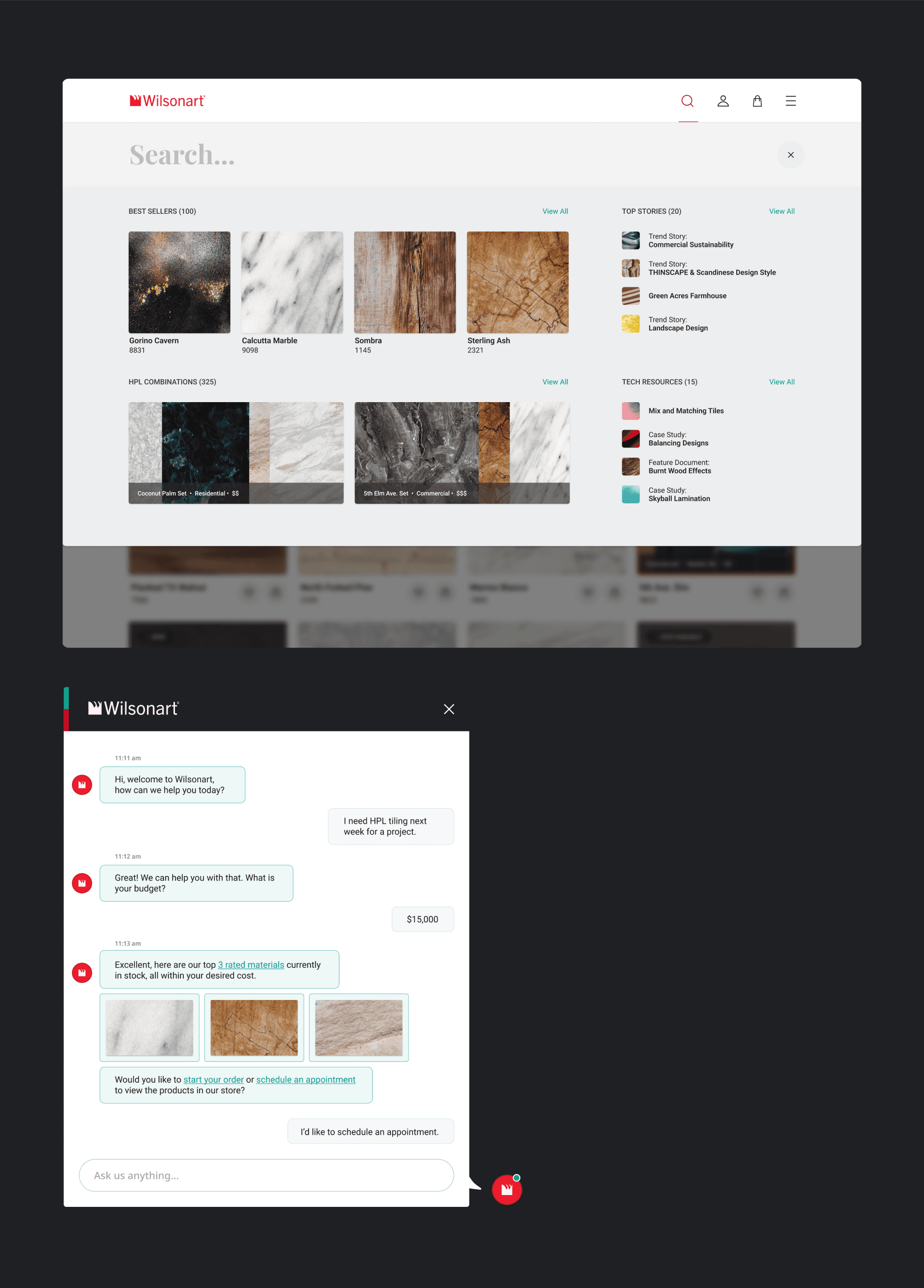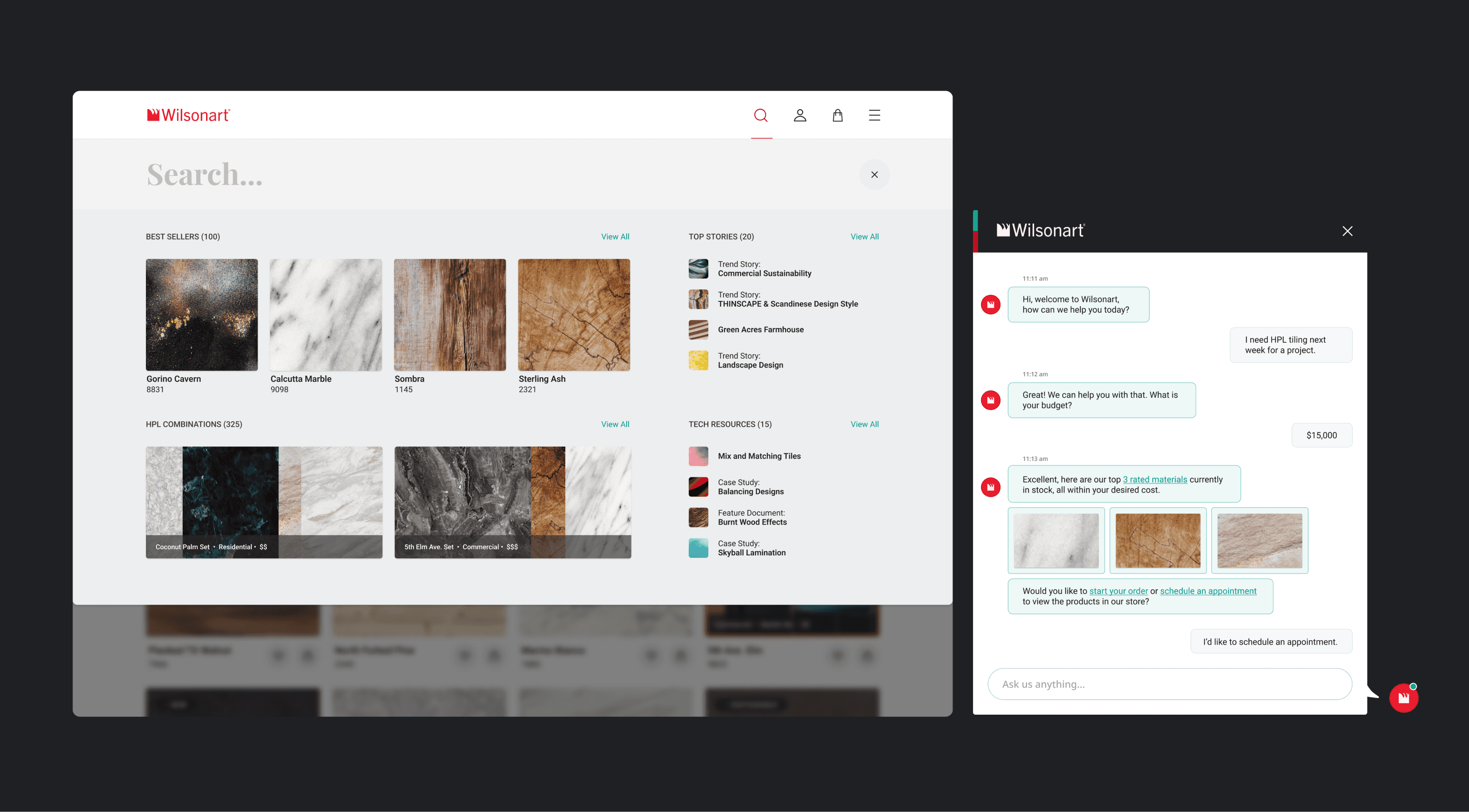 To further boost the speed and company service side of Wilsonart's digital direction, I designed a chatbot concept demonstrating how consumers could get direct quotes and sample materials based on their specific business query.