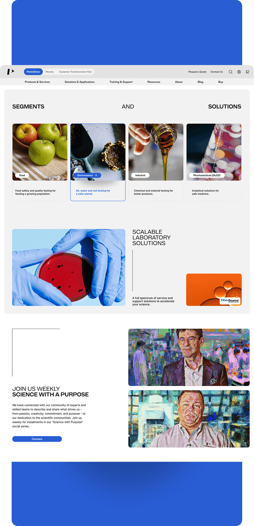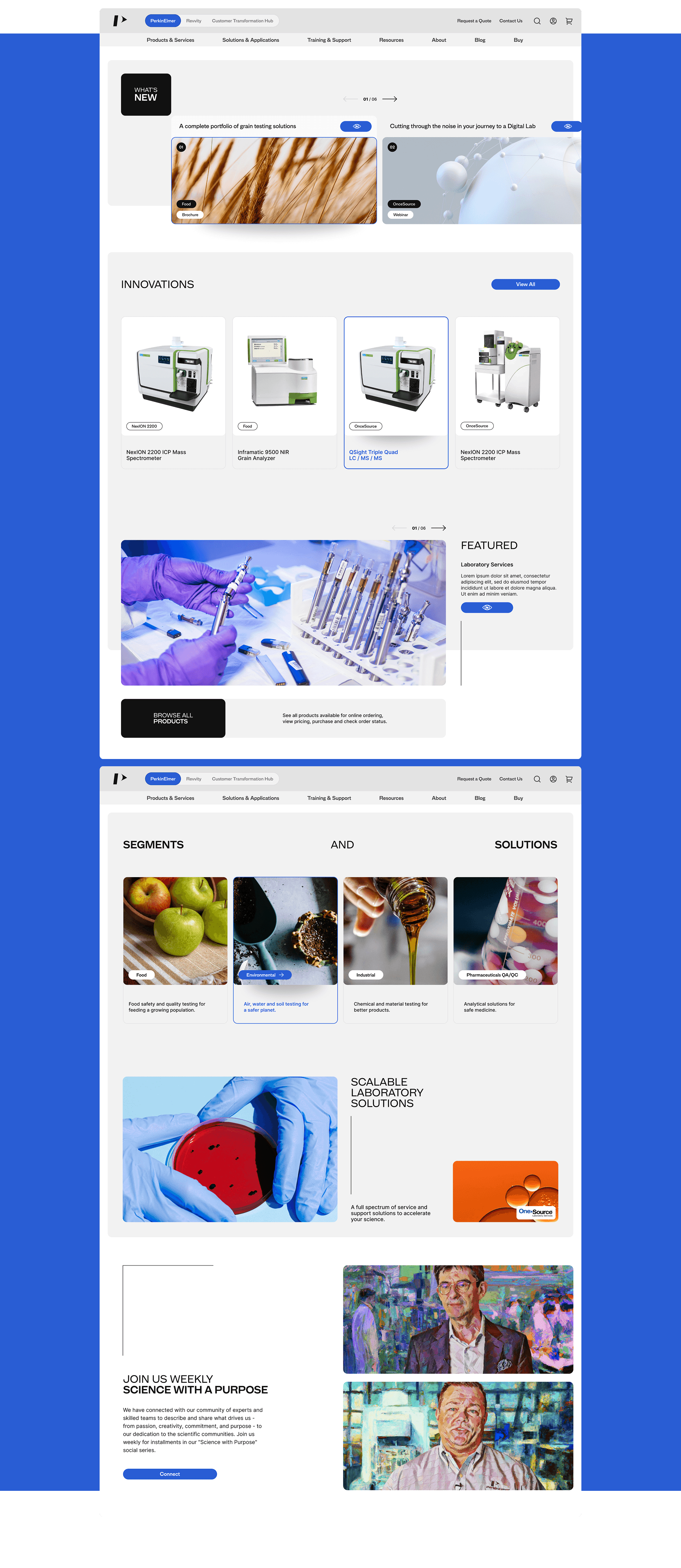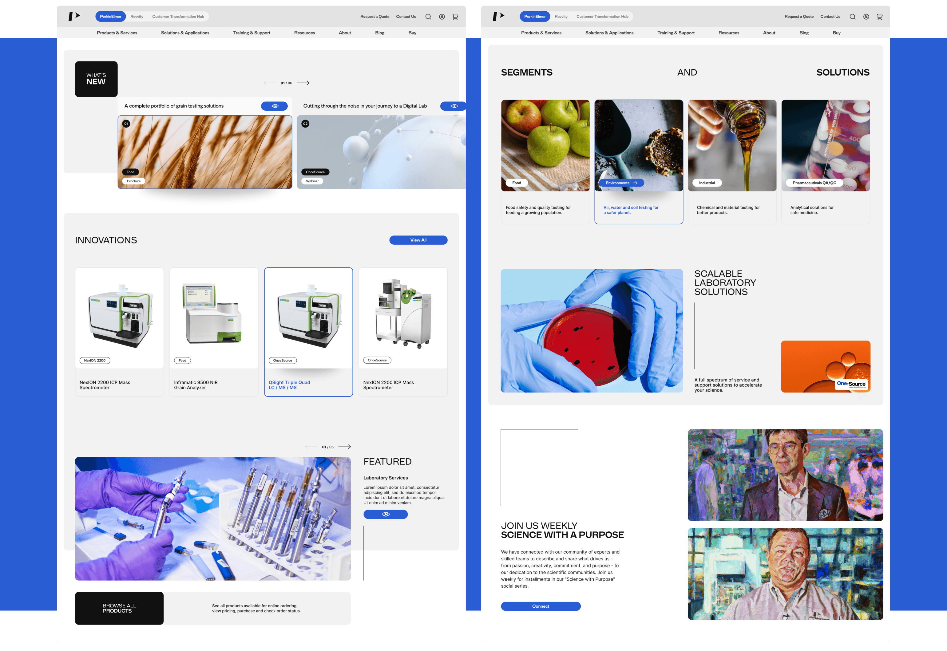 There are many components to a company that features as many products and services as PerkinElmer. On the home page I sought to explore modular expressions with a focus on adaptability and simple presentation of the business' complex tools and subjects.