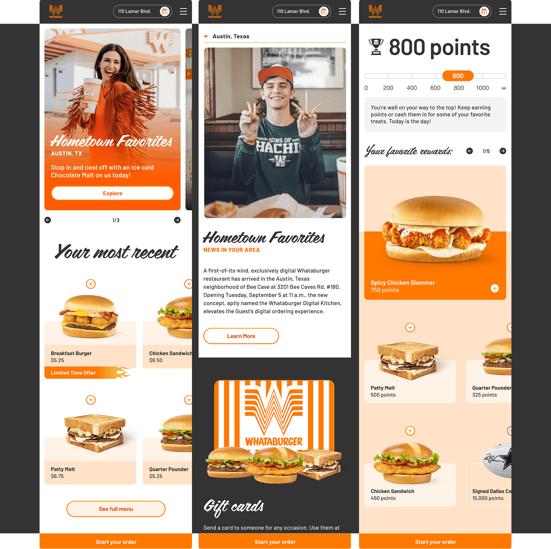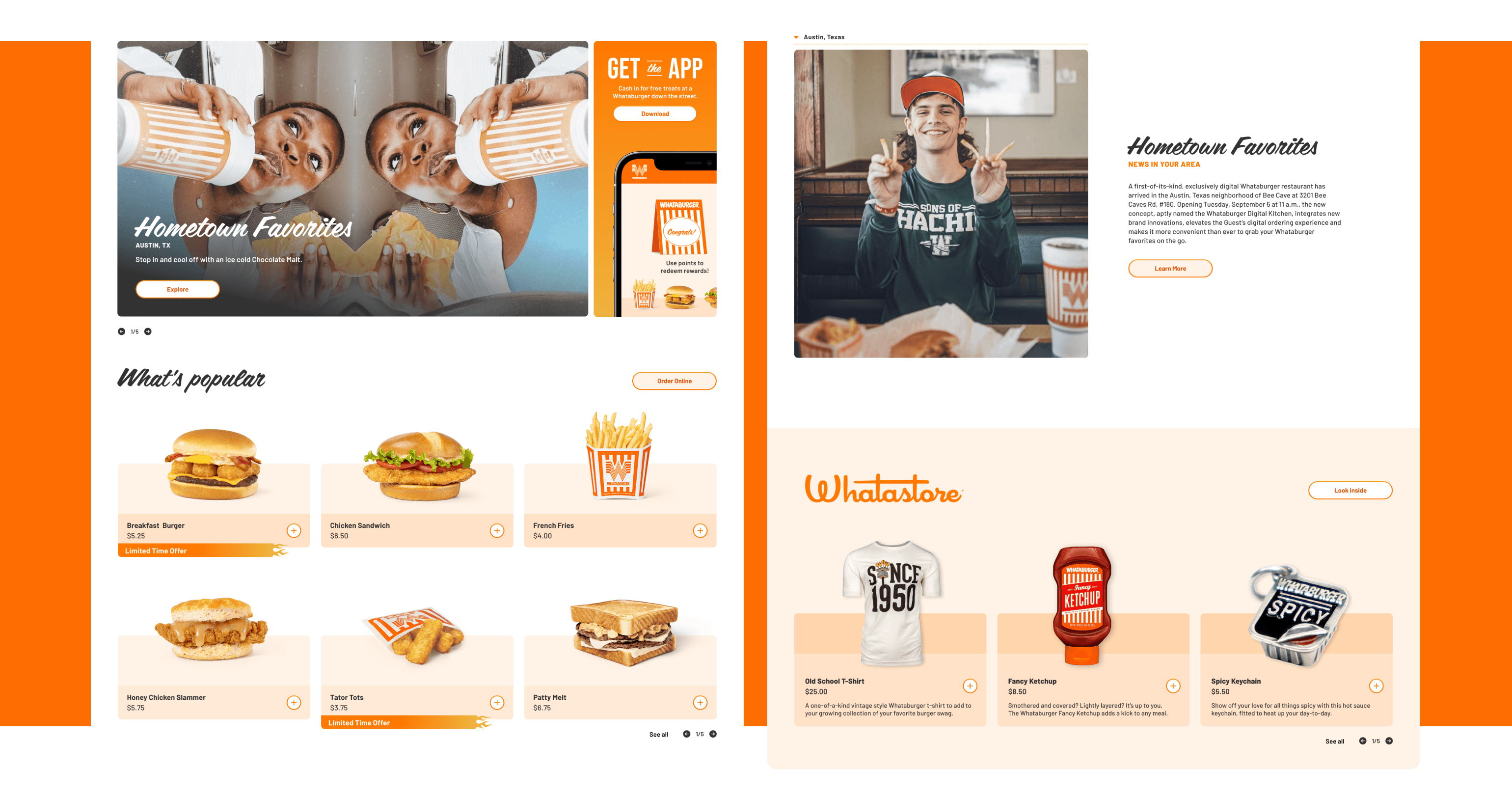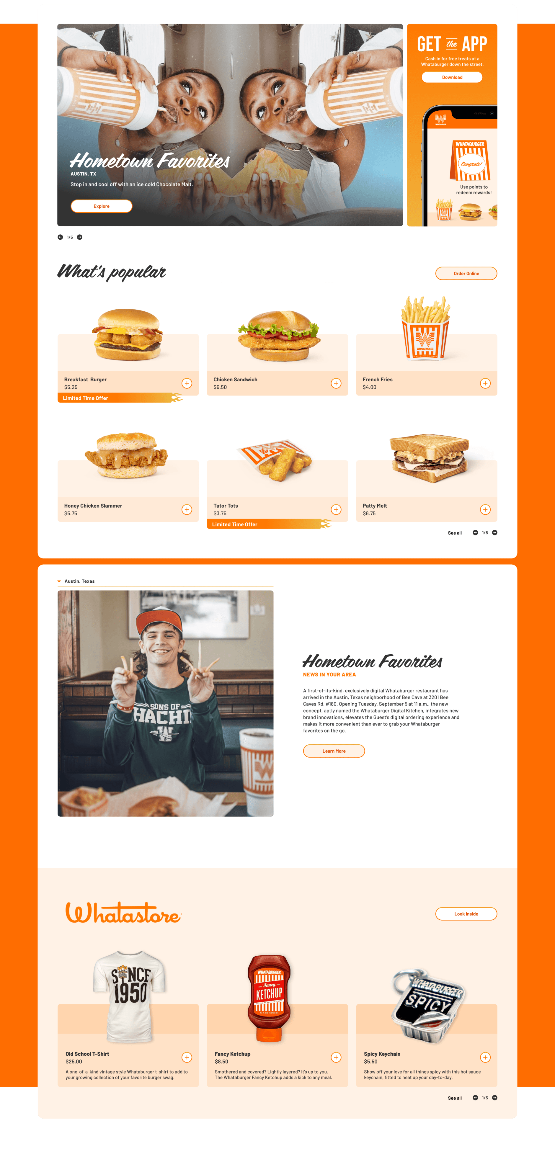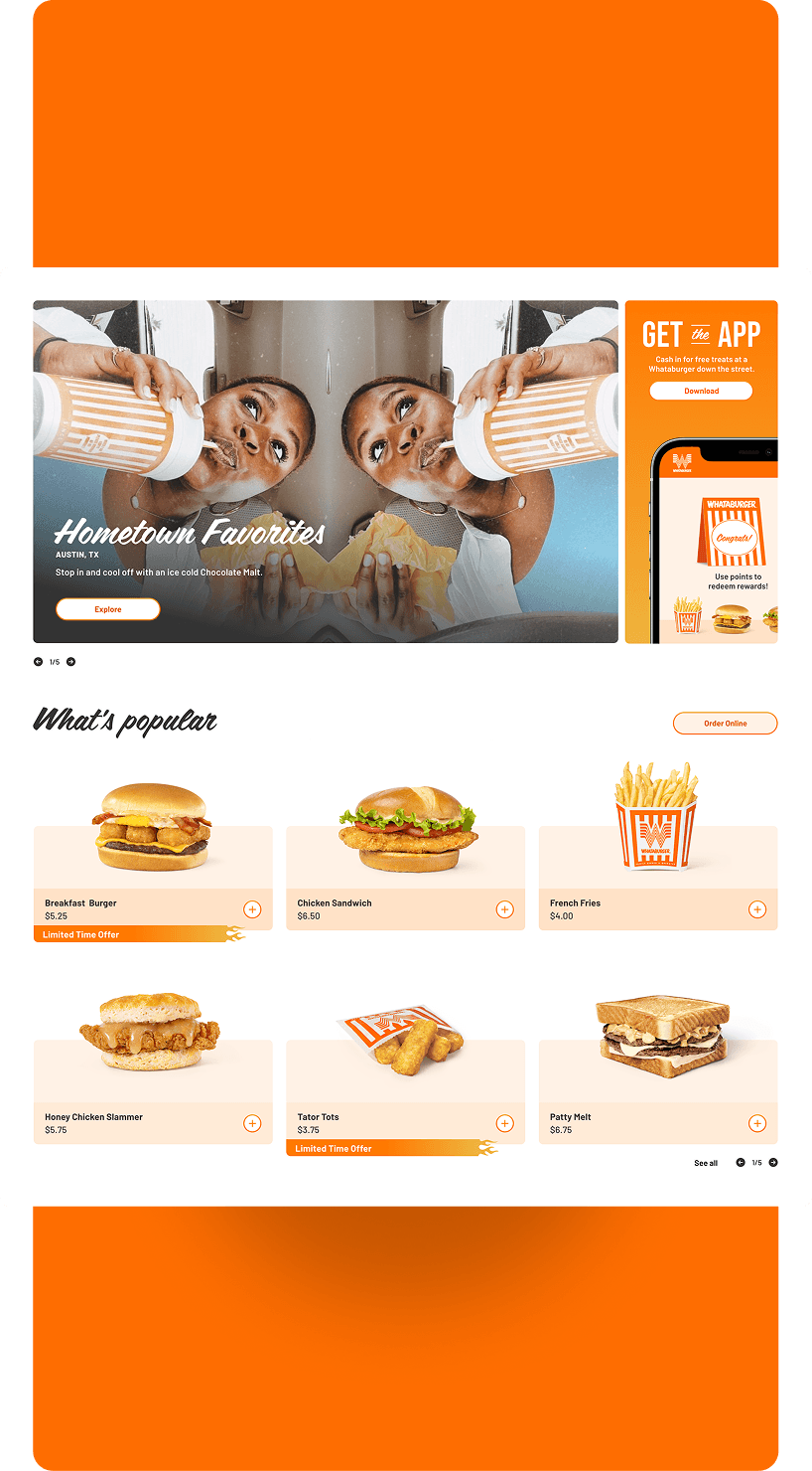 A full ecosystem of digital products deserve to feel modern and function seamlessly. For Whataburger, they wanted their website refreshed to match the aesthetic of their in-store and app experience. The brand chose to focus on earning / redeeming points from purchases, as well as a fresh way to showcase their menu.
